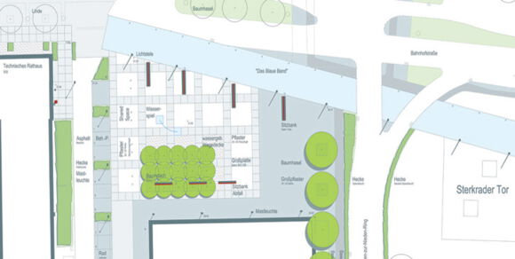 Unter dem Dach des alten Baumbestands teilt eine Achse aus anthrazitfarbenen Stelen und lang gezogenen Sitzbänken die rechtwinklige und von Straßen umgebene Platzfläche diagonal in eine befestigte und eine unbefestigte Hälfte. Während ein Wochenmarkt die mit granitfarbenem Betonsteinpflaster befestigte Platzfläche belebt, bieten die unbefestigten Bereiche Platz für eine Spielkistenlandschaft und Sitzplätze am Brunnen. Eine Pergola aus runden Stahlpylonen bildet das Tor zur Stadt. Der neue Münsterplatz richtet sich mit seinem generationsübergreifenden Ansatz an die breite Stadtgesellschaft, von Kindern im Vorschulalter, Jugendliche bis hin zu Senioren. Als Stadtplatz wurde er schon unmittelbar nach Fertigstellung fester Bestandteil der städtischen Infrastruktur. Die Planung erfolgte in enger Zusammenarbeit mit dem Amt für Verkehrsmanagement, dem Marktamt sowie dem Garten- und Friedhofsamt.